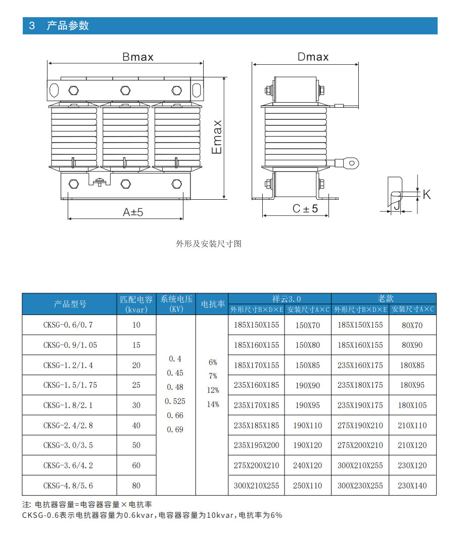 CKSG、CKDG系列串联电抗器与低压并联电容器组相串联,用以抑制电网电压波形畸变及在电容器组投入电网时限制合闸浪涌电流,也可用于其它需要限制冲击电流和滤波的场所。